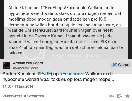 Nou, misschien vanwege het feit dat Khoulani eerder een berichte plaatste op Facebook waarin hij ISIS... daadwerkelijk verheerlijkte? En ja, Van Doorn is daarvan op de hoogte; die twitterde het bericht namelijk trots rond.
