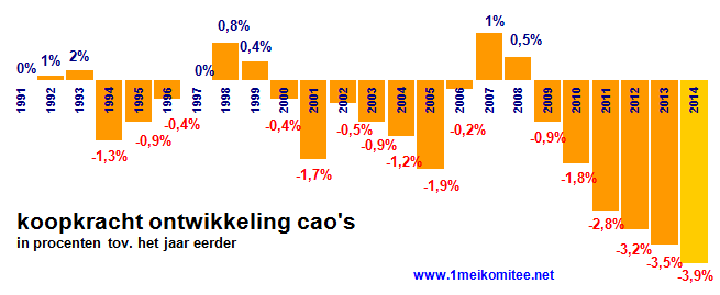 Klik hier voor cijfermatige onderbouwing. Zoals uit onderstaande tabel blijkt is de koopkracht van de Nederlandse burger in de periode vanaf 1991 tot 2014 (1991 = 100) met maar liefst 12,84% afgenomen: