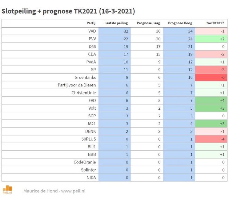 Maurice de Hond presenteert zijn slotpeiling voor de Tweede Kamerverkiezingen van 2021. De VVD wint de verkiezingen, en Splinter, Volt, Ja21, BIJ1, Code Oranje en NIDA komen mogelijk nieuw binnen. Opvallend is dat GroenLinks en 50Plus compleet onderuit gaan, terwijl FVD en PVV juist flink zijn gestegen. Volgens De Hond komt de VVD in de laatste peiling voor de