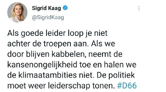 Wie schreef op Twitter: "De klimaatcrisis vraagt om grote keuzes. Samen met Europa durft Nederland die keuzes te maken. Nu snel aan het werk om de doelen te realiseren. Voor mens en natuur." Juist! Sigrid Kaag, dezelfde vrouw die gisteren naar Luxemburg (!) vloog! Wat een hypocrisie! Sigrid Kaag is terecht onder vuur komen te liggen omdat ze