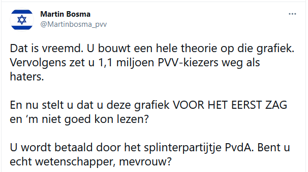 "Fascinerend dit", zegt Bosma in een reactie op de door The Post Online ontdekte blunder van De Lange. "Sarah de Lange (een door de PvdA gefinancierde 'professor') schermt met een grafiek en roept dat PVV'ers PvdA-mensen haten... Maar ze zou de grafiek VERKEERD OM gelezen hebben. En dan zijn het juist PvdA'ers die PVV'ers haten. Klopt dit?" vraagt hij haar rechtstreeks.