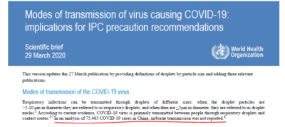 Het lullige hieraan is dat men bij de WHO met die redenering meent een onderzoek onderuit te kunnen halen dat aan lijkt te tonen dat aerosolen wel degelijk de boosdoeners zijn. Het gaat namelijk weer over het New England Journal-onderzoek, waar men met de gebruikte middelen niet exact de hoest van een mens zouden hebben nagebootst, waardoor men er eigenlijk niet meer naar wilde luisteren. Want men doet bij de WHO nu net alsof die aerosolen niet rond zouden blijven dwarrelen (en worden rondgepompt via airconditioning) als er in dat onderzoek minder hard zou worden 'geniest'.