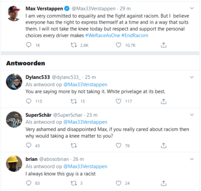 Black Lives Matter-beweging en spoorde andere coureurs aan om dit ook te doen. Maar dan wel op een specifieke manier! Ze moesten allemaal een 'End Racism' T-shirt dragen én ze moesten beloven dat ze allemaal zouden knielen, waarschijnlijk vlak voor de wedstrijd of tijdens een persmomentje. Een paar coureurs wilden echter niet (gedwongen worden om te) knielen, en daar begint het gedonder!