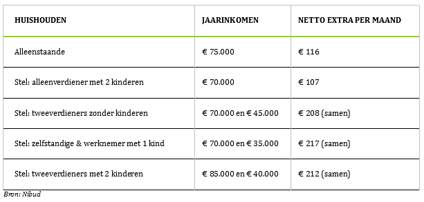 salaris en je persoonlijke financiële situatie. Vooral voor zelfstandigen kan de hoogte van het maandelijkse extraatje uiteenlopen. Wel heeft het Ministerie van Sociale Zaken een overzicht naar de Tweede Kamer gestuurd, met daarin voorbeelden van de nettosalariseffecten. Bij een gemiddeld jaarinkomen van 50.000 euro zou het gaan om 1,9 procent, bij 70.000 euro om 1,6 procent en bij 90.000 euro om 1,8 procent. Het Nibud is vervolgens aan het rekening geslagen om deze percentages voor diverse soorten huishoudens in concrete bedragen om te zetten. Hieronder zie je daarvan een paar voorbeelden.