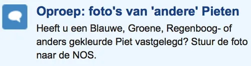 Aangezien wij ons ook hard maken voor behoud van het traditionele sinterklaasfeest met, jawel, Zwarte Piet zijn wij het daar helemaal mee eens. Maak zoveel foto's van Zwarte Pieten en stuur ze naar de NOS. Stuur er zoveel dat het ein-de-lijk tot ze doordringt dat Nederlanders helemaal niet op 'Regenboogpieten' of 'Smurfpieten' zitten te wachten.