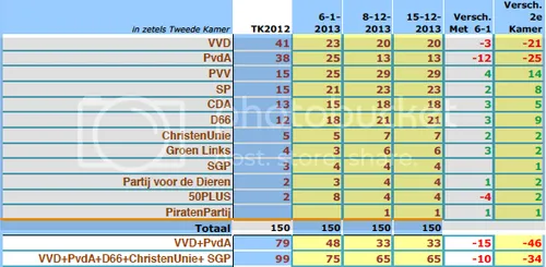 Het is nogal opvallend te noemen dat er zelfs niet één zetel verschil is - er zou immers een foutmarge in moeten zitten die wekelijks een iets ander resultaat laat zien - maar goed: u ziet het, geen enkel verschil. Alleen ten opzichte van januari 2013 is er het één en ander veranderd, met slechts drie partijen die virtuele zetels hebben ingeleverd. Alle andere partijen zijn er flink op vooruit gegaan.