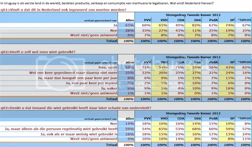 Zoals u ziet vindt maar liefst 65% van de kiezers dat de productie, verkoop en consumptie van marihuana moet worden gelegaliseerd. Het is daarbij opvallend dat dit zelfs geldt voor 49% van de CDA'ers. Slechts 43% van de christendemocraten wil het illegaal houden.