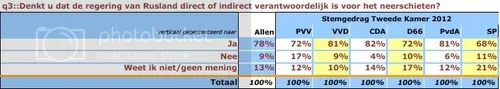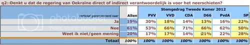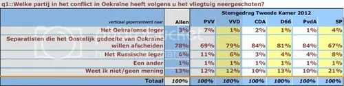 Dat lijkt me duidelijk: 78% is ervan overtuigd dat de rebellen erachter zitten. Bij PVV'ers (net als SP'ers) is dat percentage iets lager, maar je hebt het nog altijd over meer dan tweederde. Bij VVD en CDA ligt het percentage wat hoger, wat ook geldt voor D66 en de PvdA. Een duidelijke, overweldigende meerheid heeft dus prima door wat er aan de hand is.