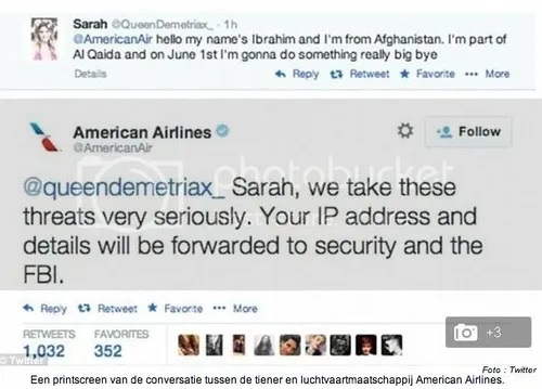 in de problemen gekomen doordat ze een bedreiging uitte aan het adres van American Airlines. De dame in kwestie tweette namelijk dat haar echte naam Ibrahim was, dat