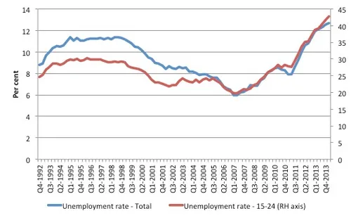 De rode lijn geeft de jeugdwerkloosheid weer, de blauwe het totaal. Met andere woorden: er is sprake van een totale werkloosheid van 13% en maar liefst 44% van de jeugd tot 25 jaar. In de grafiek boven deze column ziet u de procentuele kwartaalmutaties tussen 1993 en 2013, ik denk dat de grafiek voor zich spreekt. Dit betekent dat een groot deel van de Italianen werkloos thuis zit en dat een groot deel van de jeugd opgroeit zonder ooit gewerkt te hebben. Wat voor soort effecten zal dat sorteren denkt u? Voeg daarbij dat half Noord-Afrika de oversteek waagt en dankzij het fantastische EU-opsporingssysteem worden alle wrakke bootjes met economische 'vluchtelingen' veilig aan land gebracht. Alleen wel aan de verkeerde zijde van de Middellandse Zee.