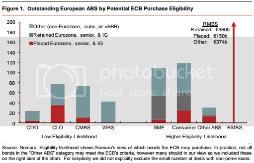 statistieken van JP Morgan blijkt, dat de markt voor gesecuritiseerde leningen zeer beperkt van omvang is. Het deel dat in euro genomineerd is zou ongeveer 885 miljard bedragen, maar het grootste deel daarvan is al door de banken beleend bij de ECB. Er is nog maar 251 miljard euro beschikbaar. Peanuts dus. Zie ook onderstaande grafiek van effectenhuis Nomura.