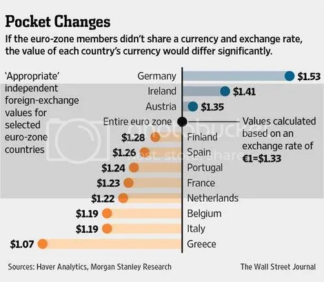 Morgan Stanley Research / WSJ (2013) -- The unfair value of the Euro for all Euro-countries, according to Morgan Stanleys 2013 PPP-analyses of the relative changes in competitiveness for each country since they joined the Euro in 1999 -- Because only the Netherlands entered the Euro with its national currency substantially (13%) undervalued, for the Netherlands the present fair value euro exchange rate is now $1.38 .