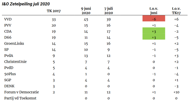 vandaag verschenen peiling van I&O Research moet de VVD een mokerslag incasseren. De coronabonus, waar de VVD de afgelopen maanden op kon rekenen, lijkt te vervallen en dat betaalt zich onmiddellijk uit: zes zetels moet de partij van Mark Rutte inleveren. Diverse partijen weten daarvan te profiteren, waaronder Forum voor Democratie van Thierry Baudet. Die stijgt 1 zetel, evenals de PVV en GroenLinks. Mede-regeringspartijen CDA en D66 halen echter de grootste buit binnen en mogen drie zetels aan hun totaal toevoegen.