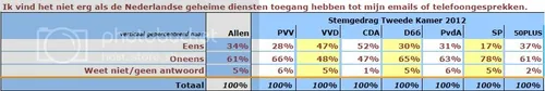 Hoe dan ook, de reden dat de PvdA het wéér moeilijk heeft is, hoe kan het ook anders, PlasterkGate. Heel gek, maar de gemiddelde linkse kiezer vindt het blijkbaar niet prettig dat hij nauwlettend in de gaten wordt gehouden door onze eigen veiligheidsdiensten. Zie deze vraag plus de bijbehorende antwoorden per partij: