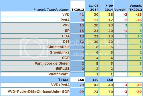 De redenen verschillen. De VVD heeft last van de opkomst van ISIS in het Midden-Oosten, terwijl de PvdA vooral gestraft wordt omdat ouderen er weer eens op achteruit gaan. De Hond legt uit in zijn email dat de VVD vooral kiezers verliest aan de PVV. Er zijn dus nogal wat kiezers die het gevoel hebben dat de zogenaamde liberalen geen oplossingen hebben voor de bedreiging die de radicale islam vormt voor de wereld, terwijl Wilders dat in hun ogen wel heeft. Of misschien denken ze bij zichzelf dat hij 'dit al jaren heeft geroepen'. Wie zal het zeggen.