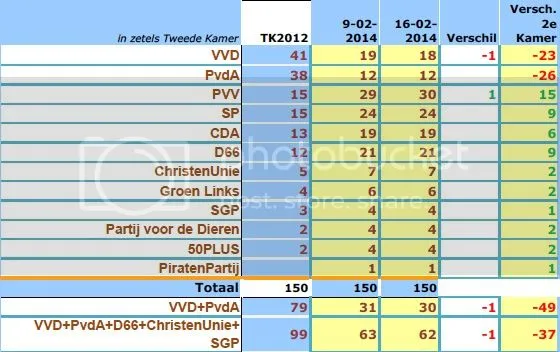 De PvdA heeft het zo mogelijk nóg slechter voor elkaar. Die partij houdt namelijk maar 12 van de 38 zetels over. Samsom en co. gaan dus opeens van grote partij naar margepartijtje die blij moet zijn als ze nog enigszins serieus wordt genomen. Het nieuwe GroenLinks, zeg maar.