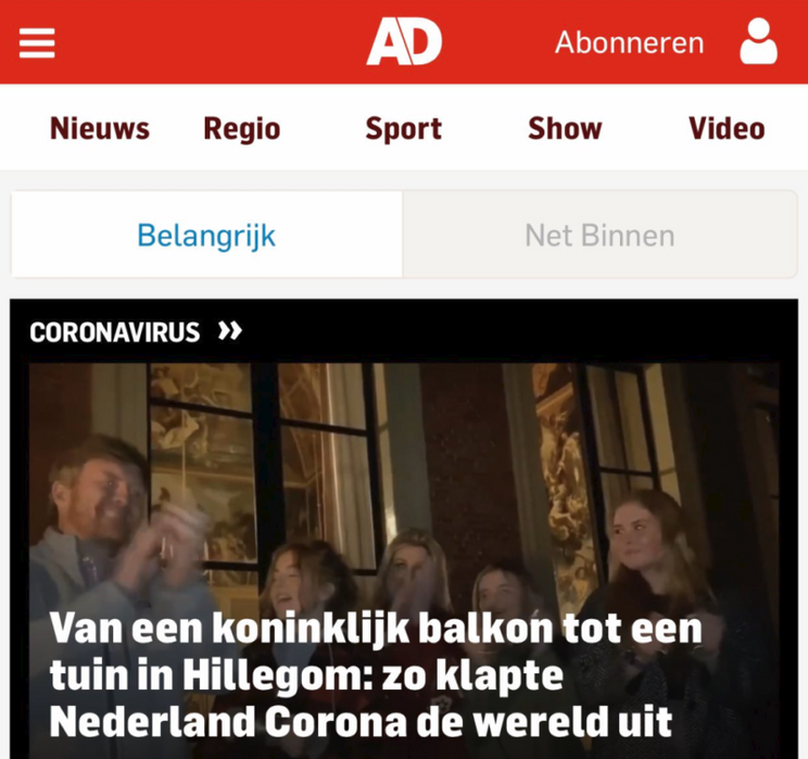 Nou, mensen. Hoe is dat dan? Om eindelijk weer eens wakker te worden in een wereld waarin het coronavirus volledig is uitgeroeid? Alle positieve energie van gisteravond heeft er namelijk in geresulteerd dat corona niet meervoorkomt. We hebben het allemaal met onze mind power weggeklapt. Hoera voor de zevende shakra! Nou ja... volgens het AD dan, hè? Het was op zich een mooi gebaar: gisteravond om acht uur klapten op veel plekken in Nederland de mensen voor iedereen die er tijdens de coronacrisis een tandje moet bijgooien terwijl een groot deel van het land juist op de bank zich zit te vervelen. Daar was dus helemaal niets mis mee.