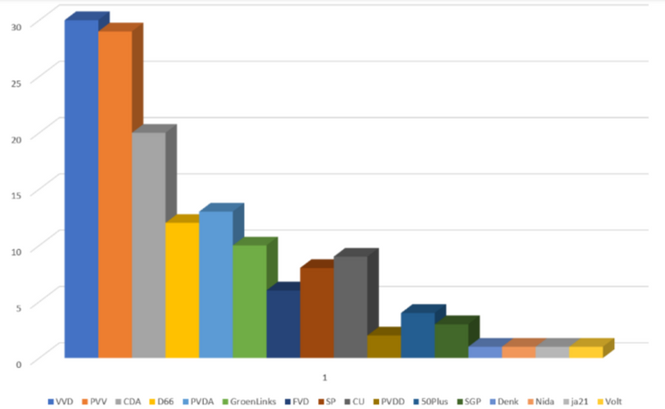 In een nieuwe peiling maakt de PVV een flinke sprong voorwaarts, en weet de beweging van Geert Wilders bijna de VVD van Mark Rutte van de troon te stoten. 29 zetels gaat de PVV halen, als het aan de big data-peiling van IT-ondernemer Eduard Nandelall ligt. De VVD blijft nog maar nipt de eerste, met slechts één zetel meer: 30. Ook komen Volt, Nida, JA21 en wellicht zelfs Lijst 30 van Willem Engel de Kamer binnen, zo luidt de opvallende prognose. De meeste