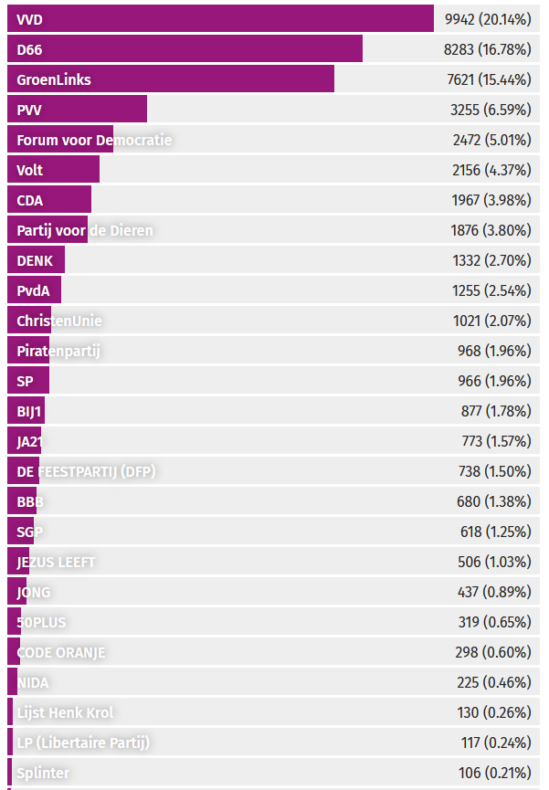 De PVV is onderuit gegaan en slinkt van 20 naar 10 zetels. Forum voor Democratie is echter flink gestegen en komt uit op 8 zetels (was 1). Opvallend is dat ook nieuwkomers als BIJ1, JA21 en Volt aardig scoren. Die eerste twee scoren allebei 2 zetels en EU-partij Volt sprokkelt maar liefst 7 zetels bij elkaar in deze verkiezingen!