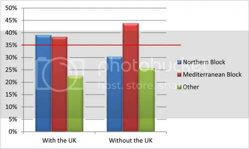 Mocht het VK uit de EU stappen dan wordt het mediterrane blok machtiger dan het Noordelijke en dus Duitse blok. Een complete verschuiving in de macht binnen de EU en verlies voor Duitsland, nota bene de geldschieter en economische motor van de Europese Unie.