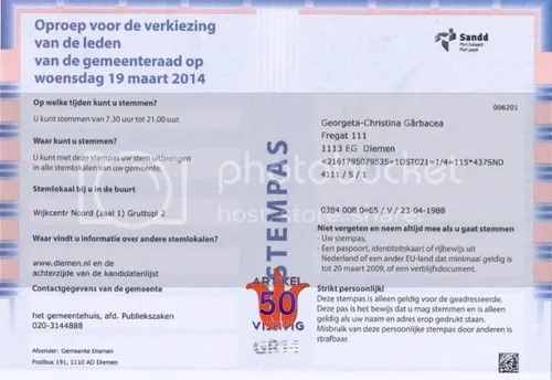 Houdt u zich even vast aan iets wat nagelvast aan de vloer verankerd is. Zie hier de stempas van Cristine uit Roemenië en studente aan de UVA in Amsterdam. Pas een kleine vier maanden(!) ingeschreven in Nederland krijgt zij van de gemeente Diemen een stempas.
