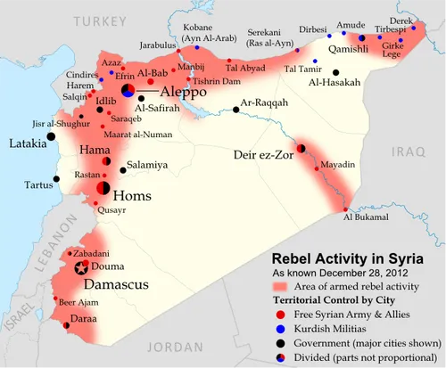 Zoals bovenstaande kaart duidelijk maakt, heeft de regering in Damascus een aantal strategische problemen op te lossen wil zij de controle over het hele land herwinnen. Een herovering van Homs lost in ieder geval een deel van die problemen op. De tamelijk eenvoudige herovering van Qusayr is een teken aan de wand dat het Syrische leger zich voldoende gehergroepeerd heeft om de komende tijd in het offensief te gaan. Daarmee is het regime van Assad een stap verder gekomen dan de situatie waaruit kolonel Ghadaffi zich moest zien los te worstelen. Dat is nog even afgezien van de westerse luchtaanvallen waarmee het Libische regime kampte.