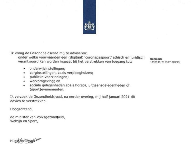 Een vaccinatiepaspoort dat je nodig zult hebben om gewoon deel te nemen aan het dagelijks leven? Dit gaat veel te ver! En het is precies waar zogenaamde "wappies" al maanden voor waarschuwen. Maar nee, dat zou allemaal heel erg meevallen! Gekkies! Complotdenkers! En nu blijkt, door deze brief van De Jonge zelf, dat het kabinet daar wel degelijk op aanstuurt.