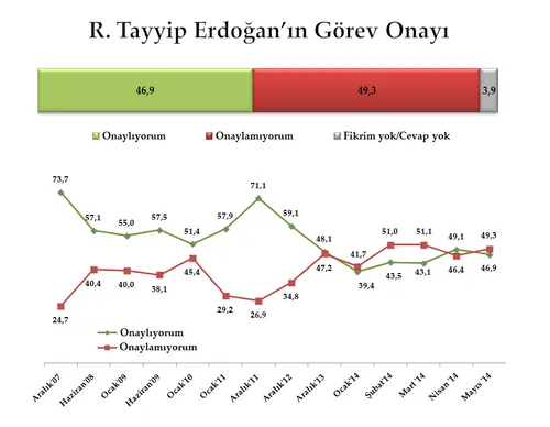 Zo verdeeld is Turkije. De rode lijn is het percentage Turken dat Erdogans beleid afkeurt, de groene lijn representeert de mensen die hem nog altijd steunen. Zoals u ziet is 49,3% van de Turken tegen Erdogan, en 'slechts' 46,9% voor hem.