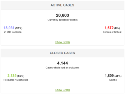 368 nieuwe sterfgevallen, waardoor het totaal nu op 1809 doden is komen te staan. 58 procent van de nieuwe sterfgevallen die vandaag zijn gemeld, komt van Italië. Het totaal aan nieuwe doden staat (op moment van schrijven) op 632. Het totaal van álle doden tot nu toe, is 6455.