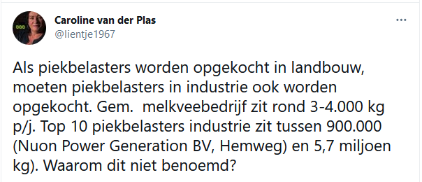 Grote industrieën mogen ongestoord blijven uitstoten en de relatief véél kleinere 'grote' boeren moeten het veld maar ruimen. Er 'moeten' namelijk héél veel huizen worden gebouwd. Daarom wordt de grote industrie ontzien en daarom doen de ondertekenaars van dit plan net alsof dit een heilzame middenweg is. Dit voelden de boeren allang aan voordat ze gingen demonstreren en nu zijn ze door LTO ook in de steek gelaten.