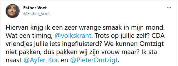 "Hiervan krijg ik een zeer wrange smaak in mijn mond. Wat een timing, Volkskrant. Trots op jullie zelf? CDA-vriendjes jullie iets ingefluisterd? We kunnen Omtzigt niet pakken, dus pakken wij zijn vrouw maar? Ik sta naast Ayfer Koç en Pieter Omtzigt", zegt deze redactrice voor NIW.