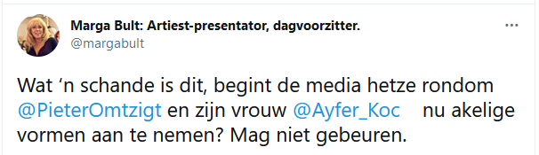 "Wat 'n schande is dit, begint de media hetze rondom Pieter Omtzigt en zijn vrouw nu akelige vormen aan te nemen? Mag niet gebeuren", stelt Marga Bult.