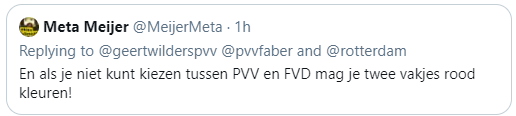 verscheuren, maar ook door rechtse kiezers in de maling te nemen in een poging ongeldige stemmen uit te lokken. Voormalig SP-senator Meta Meijer die tussen 2015-2019 in ons parlement zetelde merkte namelijk op dat twijfelaars tussen PVV en FVD beste twee hokjes rood mogen kleuren. Hetgeen leidt tot een ongeldige stem die niet wordt meegeteld.
