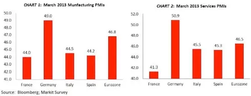 Maar de oplopende overheidstekorten zijn niet het enige probleem waar Frankrijk zich mee geconfronteerd ziet. In de volgende grafiek zien we dat het verschil met Duitsland qua productiecapaciteit gigantisch is en dat Frankrijk het zelfs slechter doet dan zwakke landen als Spanje en Italië: