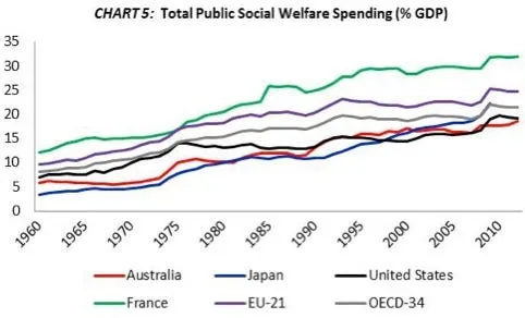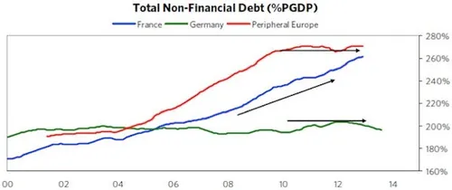 een van de betere analyses over de staat van de Franse economie, van John Mauldin, wordt de vloer aangeveegd met het beleid van de Champs Elysées. In onderstaande grafiek wordt duidelijk waar het grootste Franse probleem zit: