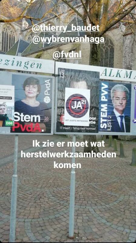 Dan heb je dus een bord waarop je posters kan hangen. Heel leuk. En wat doen die aanhangers van JA21? Die plakken 'm zo, pardoes, over een verkiezingsposter van Forum voor Democratie heen. Je weet wel: de partij waar deze lieden een paar maanden geleden nog bij hoorden, maar die ze nu verguisden omdat Thierry Baudet zich niet zomaar liet wegwerken toen zij een ranzige coup probeerden uit te voeren.