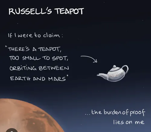 Let op het “too small to spot”: wat te klein is om te zien, kan dus niet worden gezien. Je kan dus veilig claimen dat zich een theepot tussen de aarde en mars bevindt die te klein is om te zien zonder dat de stelling kan worden ontkracht.