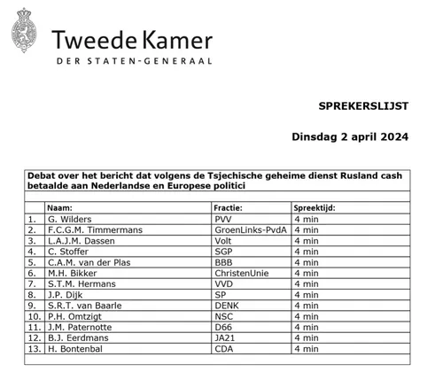 Vanmiddag vindt het plenair debat plaats in de Tweede Kamer over “het bericht dat volgens de Tsjechische geheime dienst Rusland cash betaalde aan Nederlandse en Europese politici” (16:30 - 22:30 uur). Inmiddels is ook duidelijk dat het verhaal over de omgekochte politici ook bij de AIVD bekend zou zijn. Al maanden lang zelfs. En daarmee is nog niets gebeurd. Aan minister Hugo de Jonge van binnenlandse zaken, verantwoordelijk voor de AIVD, is gevraagd opheldering te geven. Die heeft geantwoord dat hij een onderzoek wil starten en daar voor het zomerreces resultaten over bekend wil maken. Ná de Europese verkiezingen dus van begin juni. Omkoping van politici met buitenlands geld mag niet boven de markt blijven hangen
