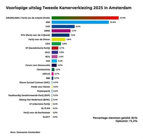 Waar in de rest van het land kiezers massaal kiezen voor verandering, kiest de hoofdstad koppig voor het oude kartel. GroenLinks-PvdA en D66 domineren volledig. Volgens de voorlopige tellingen (81% van de stemmen geteld) haalt GroenLinks-PvdA 27,4%, D66 23,4%. Samen goed voor meer dan de helft van alle stemmen in de stad.