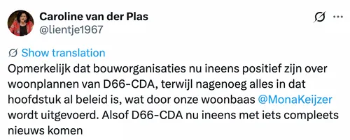 "Opmerkelijk dat bouworganisaties nu ineens positief zijn over woonplannen van D66-CDA, terwijl nagenoeg alles in dat hoofdstuk al beleid is, wat door onze woonbaas Mona Keijzer wordt uitgevoerd," sneert ze.