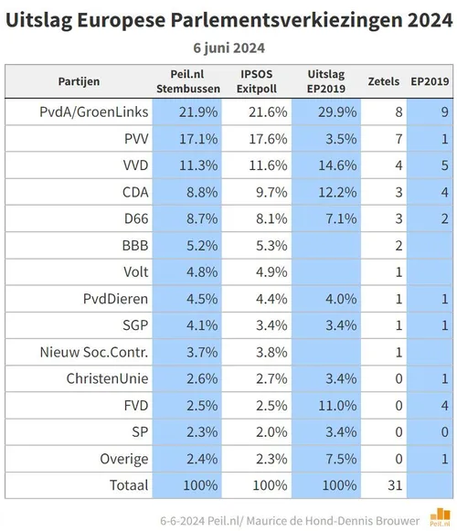 De uitslag van de Europese Parlementsverkiezingen 2024 is bekend! Nou ja, nog niet officieel, natuurlijk. 'Officieel' mogen we zondag pas weten wat de echte uitslag honderd procent is. Maar Maurice de Hond heeft alle uitslagen van de stemlokalen bij elkaar opgeteld en kan ons daarom nu met honderd procent zekerheid vertellen wat de uitslag is. En die komt erop neer dat GroenLinks-PvdA inderdaad de grootste is, dat de PVV tweede is, dat BBB in het EP komt 2 zetels, en dat de SGP meer stemmen heeft gekregen dan NSC. In aanloop naar de verkiezingen werd ons verteld dat het een tweestrijd zou worden tussen