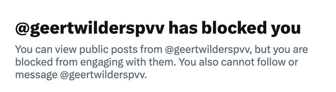Maar het blijft niet bij Jensen. Ook ondergetekende is het slachtoffer geworden van de lange tenen van de PVV-leider. Toen ik mijn tijdlijn checkte, zag ik tot mijn verbijstering de melding: "@geertwilderspvv has blocked you". "Huh, wat? Waarom heeft @geertwilderspvv mij in vredesnaam geblockt?" vroeg ik me hardop af op X.