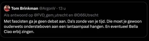 De demonisering van Forum voor Democratie heeft een levensgevaarlijk dieptepunt bereikt. De communisten en hun linkse trawanten hebben het gevoel dat ze onaantastbaar zijn in Nederland, en dat leidt tot pure doodsbedreigingen. Een ambtenaar uit Twente, Tom Brinkman, heeft openlijk opgeroepen om de 19-jarige FVD-lijsttrekker in Utrecht, Nina Bodnárová, te lynchen. Zijn walgelijke voorstel? "Die moet je gewoon ouderwets ondersteboven aan een lantaarnpaal hangen." Dit is het directe gevolg van de haatcampagne die door D66, VVD en het hele kartel wordt gevoerd. Terwijl de politieke elite in Amsterdam gezamenlijke verklaringen tekent om