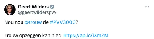 Wilders vindt dit logischerwijze totaal niet kunnen. Hij reageert geschrokken online en spreekt Trouw direct aan. Daarbij laat hij Nederlanders ook weten dat ze de krant heel snel en gemakkelijk kunnen opzeggen via