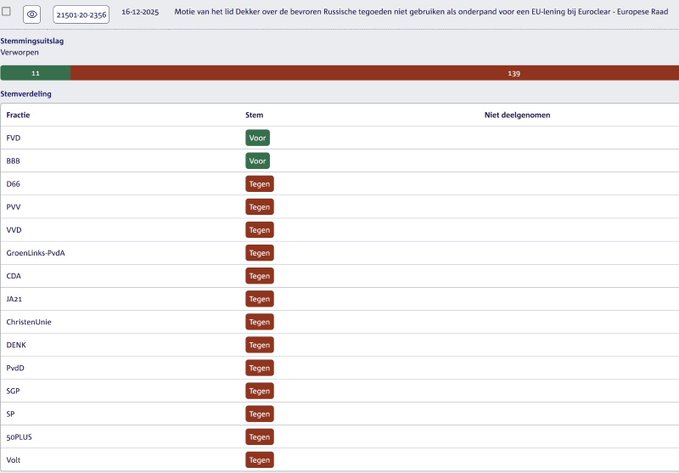 Het bewijs is onweerlegbaar. Er lag namelijk een motie van FVD-Kamerlid Dekker op tafel die precies regelde waar Hoogeveen nu zo bang voor is: de motie riep op om de bevroren Russische tegoeden niet te gebruiken als onderpand voor leningen.