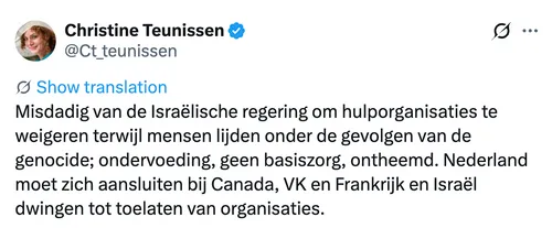 wond er op X geen doekjes om. "Misdadig," noemde ze het besluit van de Israëlische regering. Ze spreekt over ondervoeding, het ontbreken van basiszorg en een situatie die ze omschrijft als genocide. Nu kunnen we twisten over juridische definities, maar de feiten op de grond liegen niet. "Nederland moet zich aansluiten bij Canada, VK en Frankrijk en Israël dwingen tot toelaten van organisaties," aldus het
