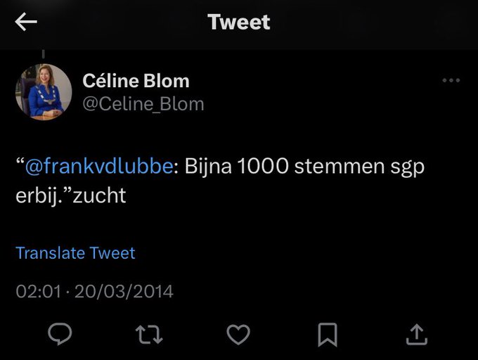 SGP'er Tom de Nooijer vindt het ook raar. Hij maakt duidelijk dat Nunspeet een "SGP-bolwerk" is... en dat Blom juist een hekel aan SGP'ers heeft. Kijk maar naar deze tweet van mevrouw Blom die hij heeft opgevist:
