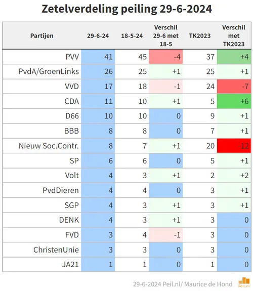 Maurice de Hond blijkt dat de vier regeringspartijen nu op 74 zetels staan. Dat zijn er maar liefst 13 minder dan op 22 november 2023. Die wanstaltige tussenstand is niet te wijten aan BBB en PVV. Sterker nog, die twee partijen doen het beter dan 9 maanden geleden. De PVV staat nu op 41 zetels (+4 ten opzichte van de verkiezingen) en BBB op 8 (+1).