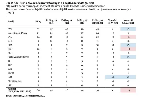 De peiling is echter niet alleen goed nieuws voor FVD. De PVV doet het ook nog altijd heel goed, met 5 zetels winst ten opzichte van vorig jaar. Toch moet Wilders oppassen. Ten opzichte van