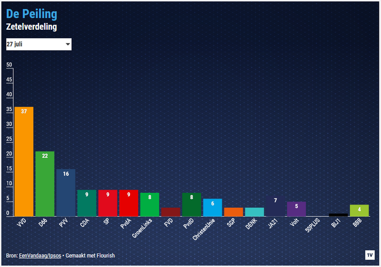 Ui de peiling van EenVandaag blijkt dat de VVD en D66 veilig bovenaan staan. De VVD staat deze maand op 39 zetels staat, 5 meer dan bij de laatste verkiezingen. D66 komt deze maand uit op 21 zetels (-1), wat betekent dat de kiezers van beide partijen niet weg zijn gegaan. Het